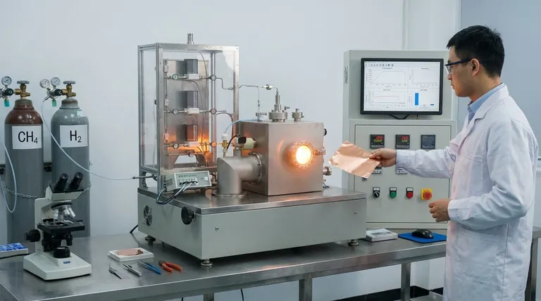 The entire process takes place inside a sealed furnace or reaction chamber, which allows for precise control over the atmosphere. Inside, a substrate—typically a thin foil of a catalytic metal like copper—is heated to temperatures often exceeding 1,000°C. This high temperature provides the necessary thermal energy to drive the chemical reactions.
