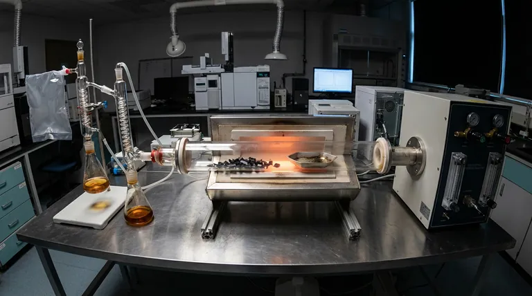 - If your primary focus is rigorous mass balance data: Prioritize the efficient flow and condensation setup to ensure complete capture and quantitative analysis of oil, gas, and solids.